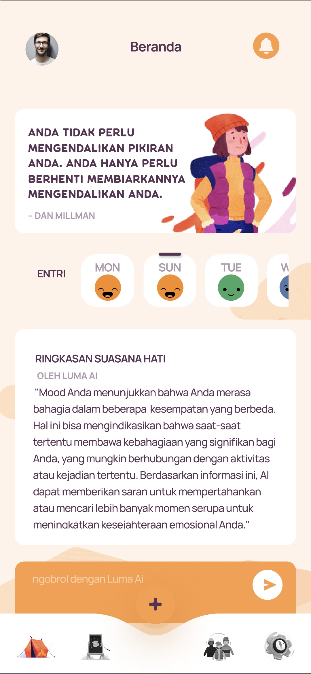 Di tengah kesadaran yang semakin meningkat tentang pentingnya kesehatan mental, masih banyak individu yang menghadapi tantangan dalam mengenali dan mengelola emosinya. Stigma sosial, keterbatasan akses terhadap layanan profesional, serta tekanan hidup yang semakin kompleks menjadi hambatan dalam menjaga kesejahteraan mental. Mindwell hadir sebagai inovasi berbasis kecerdasan buatan yang dirancang untuk membantu pengguna memahami emosinya dengan lebih baik. Melalui fitur seperti mood tracker, saran aktivitas personal berbasis AI, dan pustaka kesehatan mental, aplikasi ini memberikan pendekatan yang lebih personal dan interaktif dalam mendukung kesejahteraan emosional. Saat ini, Mindwell masih dalam tahap pengembangan dan penyempurnaan agar dapat memberikan pengalaman terbaik bagi penggunanya. Dengan terus melakukan riset dan pengujian, diharapkan aplikasi ini dapat menjadi solusi yang lebih efektif dan bermanfaat bagi individu yang ingin lebih peduli terhadap kesehatan mental mereka.