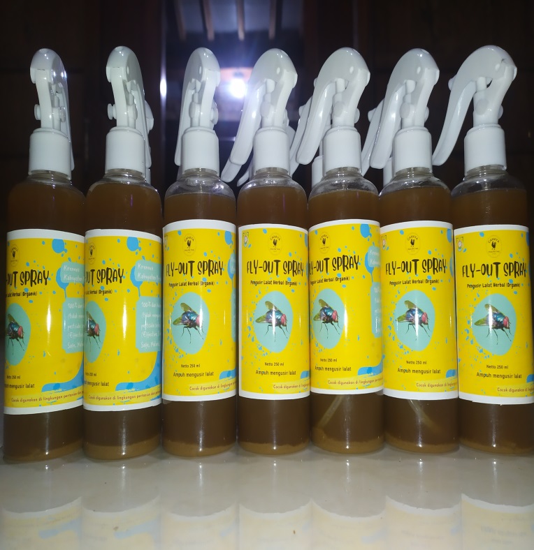 Pembangunan pertanian dan pangan di Indonesia menjadi sangat penting karena menjadi penopang pertumbuhan ekonomi nasional. Salah satu kendala pengembangan pertanian dan peternakan di Indonesia adalah adanya serangan hama lalat. Pengendalian lalat yang banyak dilakukan oleh petani adalah dengan menggunakan insektisida kimia dengan cara menyemprotkan pada tanaman, buah, sayur maupun kandang ternak. Alternatif pengendalian lalat yang dapat mengurangi dampak negatif akibat penggunaan insektisida kimia berlebihan adalah dengan menggunakan insektisida organik seperti fly-out spray. Fly-out spray merupakan pembasmi lalat alami berbahan dasar campuran herbal tumbuh-tumbuhan seperti buah mahoni, tembakau, daun kemangi, dan mikroorganisme EM4. Tanaman tersebut mengandung beberapa senyawa saponin, eugenol, dan flavonoid yang bersifat racun pada serangga sehingga efektif dalam mengusir dan membasmi lalat. Proses pembuatan fly-out spray terdiri dari beberapa tahapan yaitu pengumpulan bahan baku, pembuatan produk, pengemasan, dan aplikasi penggunaan fly-out spray di lingkungan pertanian dan peternakan. Fly-out spray mempunyai beberapa keunggulan diantaranya dapat digunakan sebagai pengusir lalat yang ramah lingkungan, aman dan terjangkau, ampuh membasmi lalat, dan mudah diaplikasikan dilapangan. Aplikasi fly-out spray di masyarakat sangat berpotensi diterapkan dikalangan petani dan peternak. Pembuatan insektisida organik fly-out spray yang mudah dan tidak membutuhkan biaya tinggi sangat memungkinkan untuk diproduksi secara mandiri. Fly-out spray juga sangat berpotensi untuk di produksi skala industri karena profit yang dihasilkan cukup besar dengan marjin keuntungan diatas 75%. Peluang bisnis dan komersialisasi fly-out spray sangat terbuka lebar seiring dengan kesadaran masyarakat akan penggunaan insektisida kimia untuk beralih ke insektisida organik dalam sektor pertanian dan peternakan.